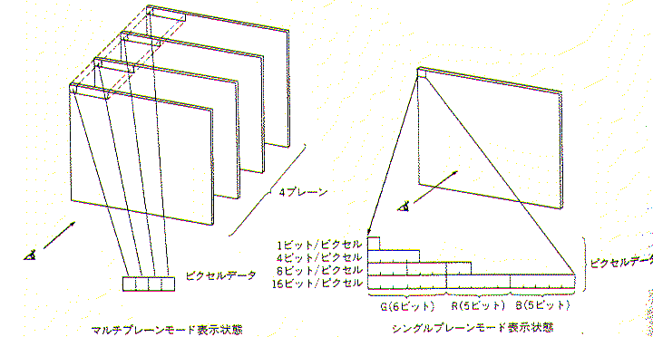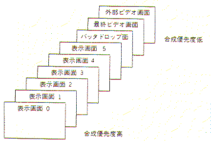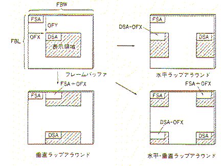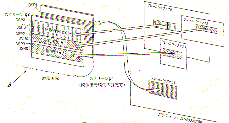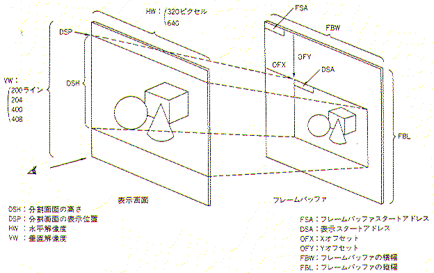 グラフィック画面表示は、グラフィックVRAMに設けられた仮想画面(フレームバッファ)をディスプレイ(正確には分割画面)にマッピングすることによって行なわれる、というイメージです。